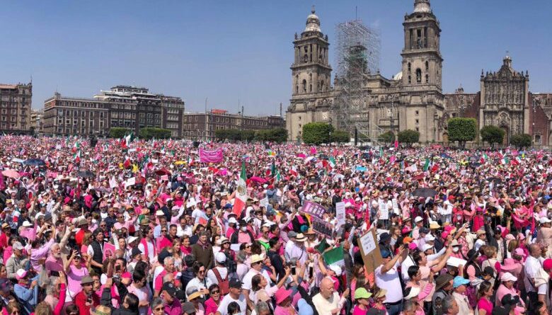 Durante la congregación denominada “Marcha por la Democracia“, el Zócalo capitalino de la Ciudad de México lució repleto, pero sin la Bandera monumental que tradicionalmente se iza al centro del Zócalo Capitalino.