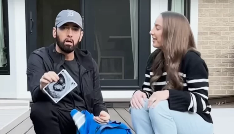 Inmediatamente después, Eminem publicó un clip casero que mostraba la foto de una ecografía de un bebé que estaba oculta dentro de la camiseta de futbol, por lo que el intérprete de Real Slim Shady parece conmocionado al recibir la noticia.
